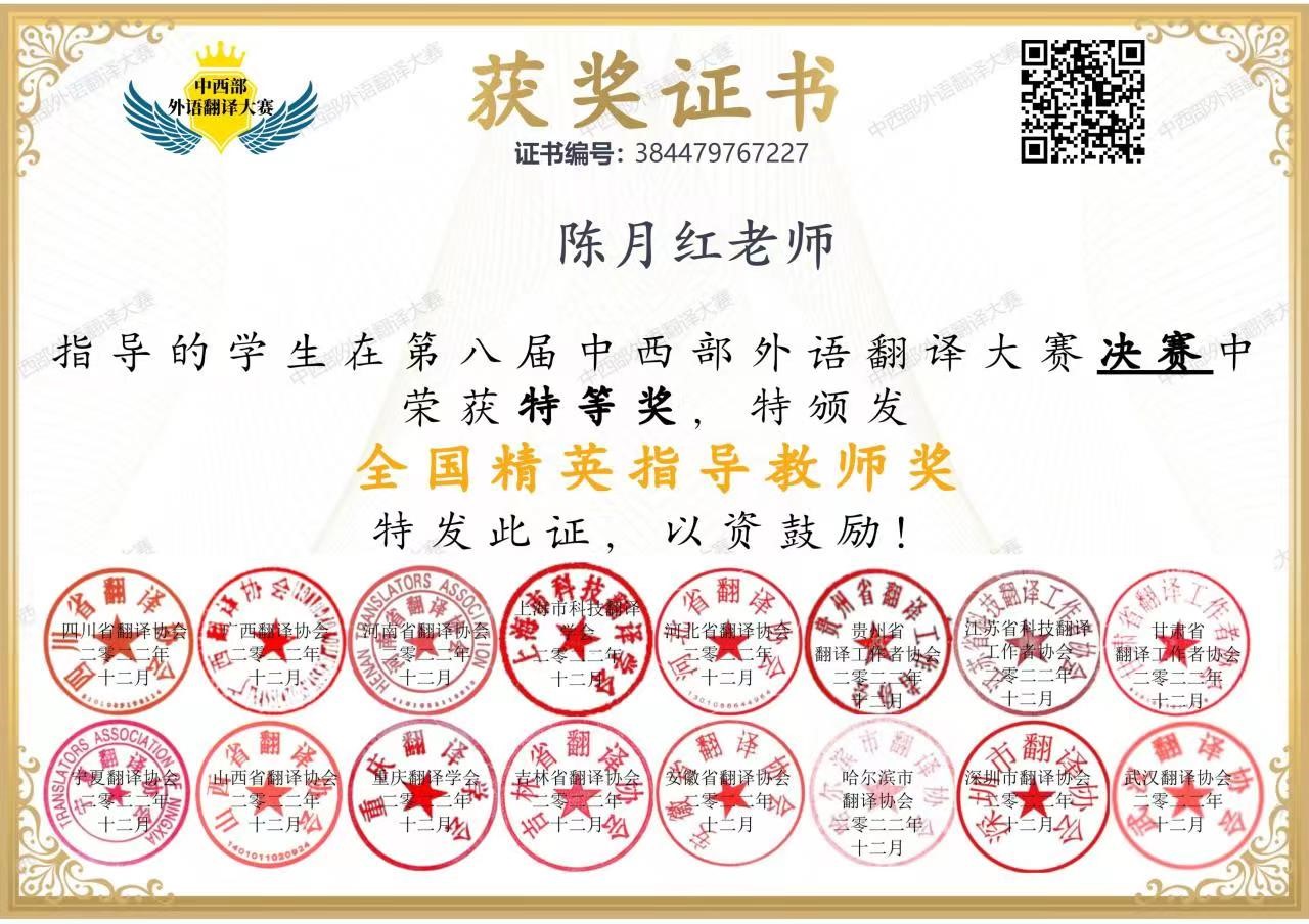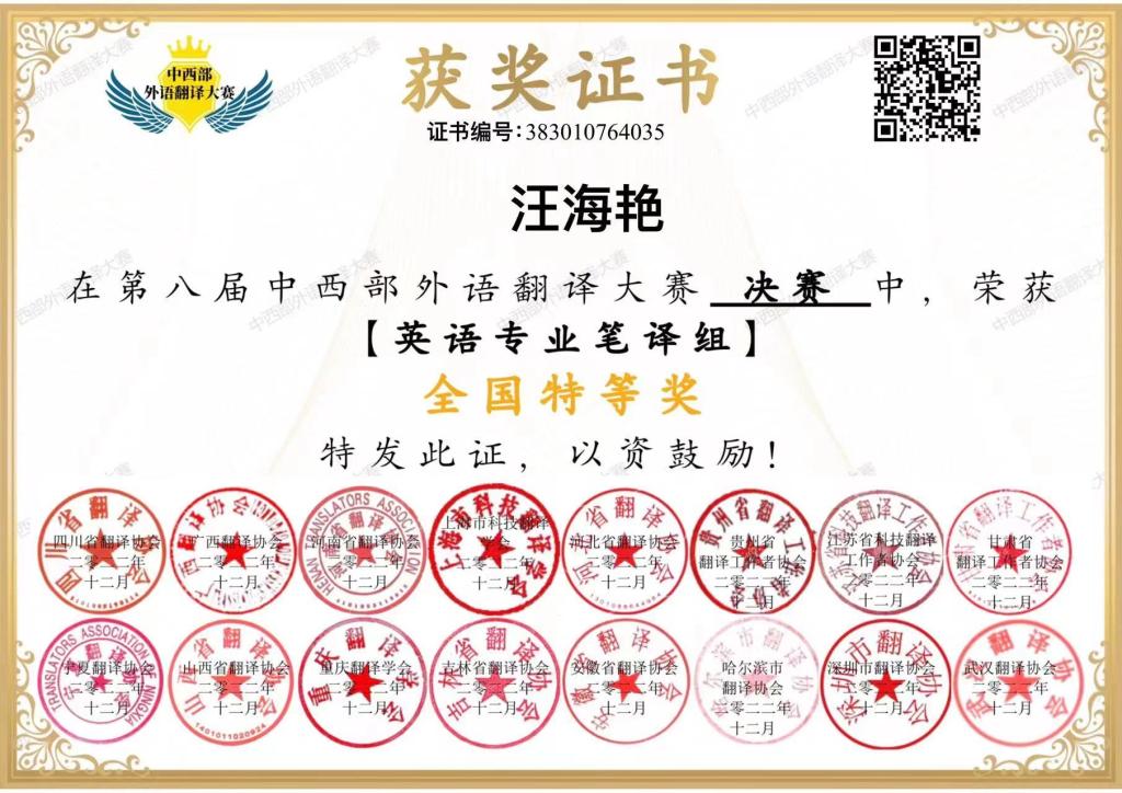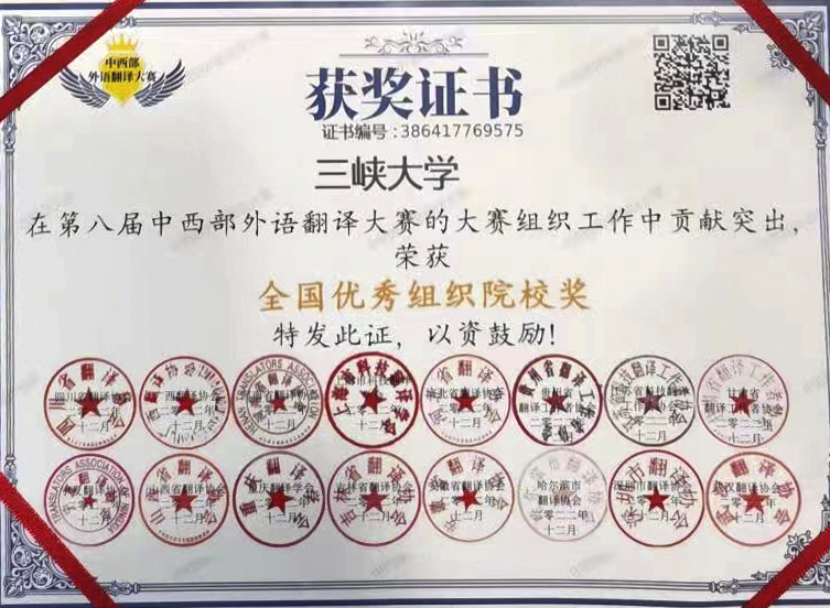 本网讯(通讯员 伍钢)新学期伊始,从全国第八届中西部外语翻译大赛组传来好消息,外国语学院2022级英语笔译专业硕士研究生汪海艳经过激烈角逐,获得英语专业笔译组全国特等奖的优异成绩,指导教师陈月红教授获全国精英指导教师奖,外国语学院获最佳组织奖。此前,学院2019级法语专业本科生王娜同学也获得第三十四届韩素音国际翻译大赛季军,获得汉译法三等奖,而本届的汉译法组全国奖项设置情况为:一等奖空缺,二等奖1名,三等奖2名(三峡大学王娜与上海外国语大学另一同学分享),优秀奖9名。