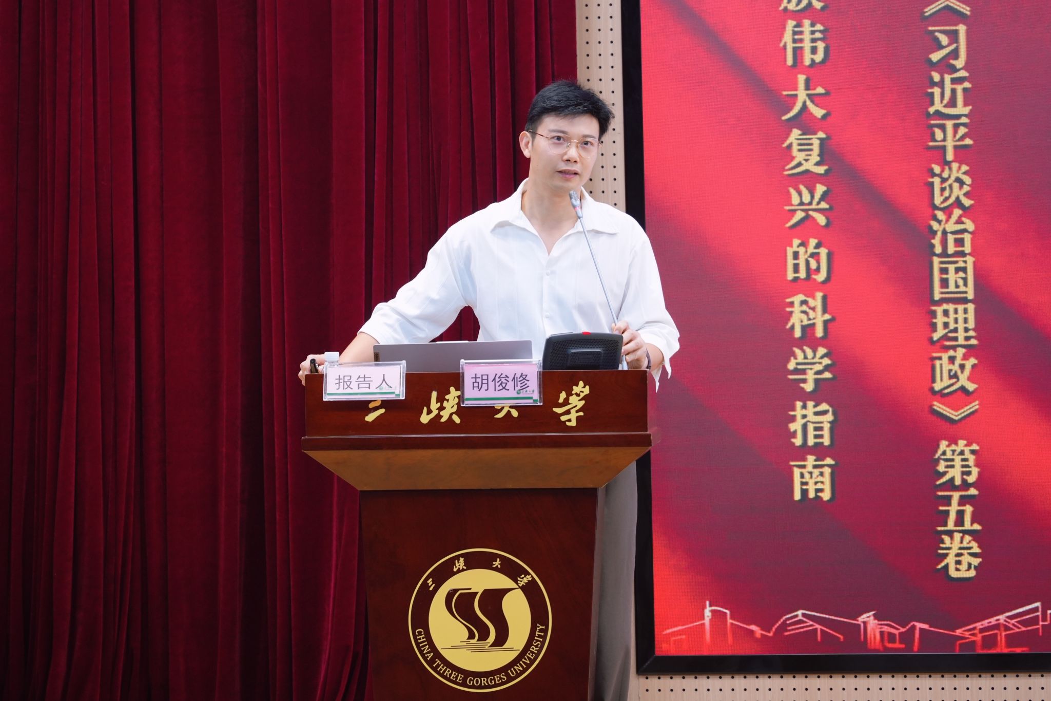 本次学习,特邀宜昌市委宣讲团成员、马克思主义学院胡俊修教授作了题为《指引中华民族伟大复兴的科学指南——深入学习<习近平谈治国理政>第五卷》的专题辅导报告。他从“充分认识重大意义、系统领悟精髓要义、深刻理解理论品格、深入践行实践要求”等四个方面,对第五卷作了系统阐述和深刻讲解。报告理论扎实、内容翔实,起到了很好的导学作用。