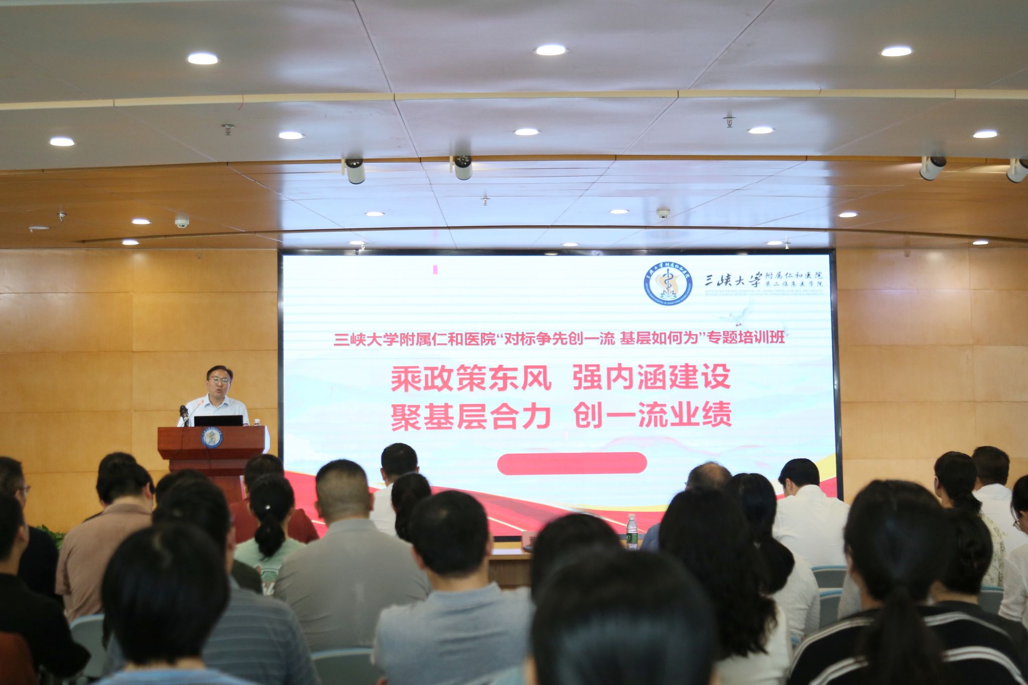 本网讯(通讯员 王春双 李金琼)为进一步巩固拓展学习教育成果,推动学校和医院事业高质量发展,锲而不舍落实中央八项规定精神、推进作风建设常态化长效化,按照学校党委统一部署,9月27日下午,附属仁和医院党委举办“对标争先创一流 基层如何为”专题培训班第一场。学校党委常委、副校长杨简到会指导,医院党委领导班子成员、中层干部及班组长、各基层党支部书记及支部委员等近200人参加培训。
