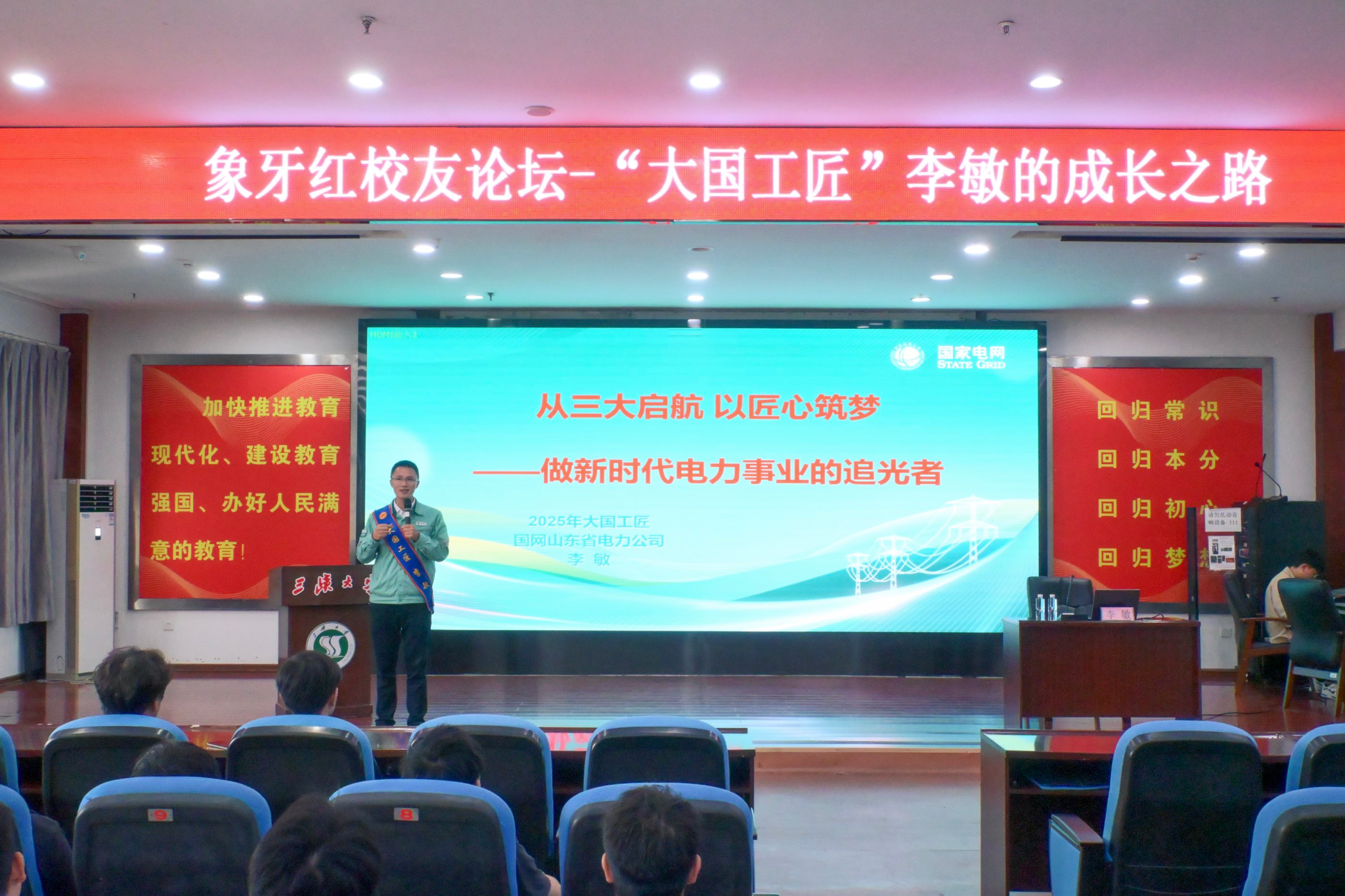 本网讯(通讯员 周颖)9月29日,三峡大学2011届电气工程及其自动化专业优秀校友、2025年“大国工匠”称号获得者,全国五一劳动奖章、齐鲁大工匠、国网楷模、国家电网公司劳动模范李敏重返母校,应邀出席电气与新能源学院“象牙红”校友论坛,学院教师代表及250余名研究生参加活动。学校党委副书记、副校长黄悦华热情会见李敏校友。